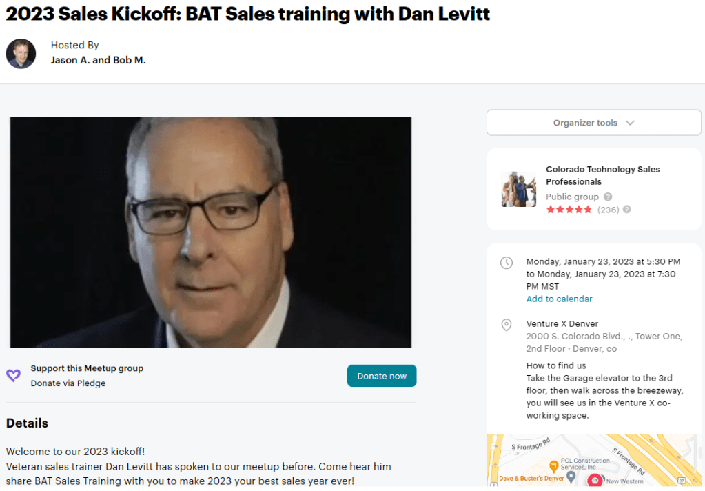 Dan Levitt is a long-time member of our group and this is his third time presenting for the CTSP. Dan is presenting on Sandler Sales Methodology, the same sales school that I was taught at Oracle Corp. We’re really excited on this return visit. If you are up for it, we also do an informal HH across from Venture X co-working after the meetup January 23rd.